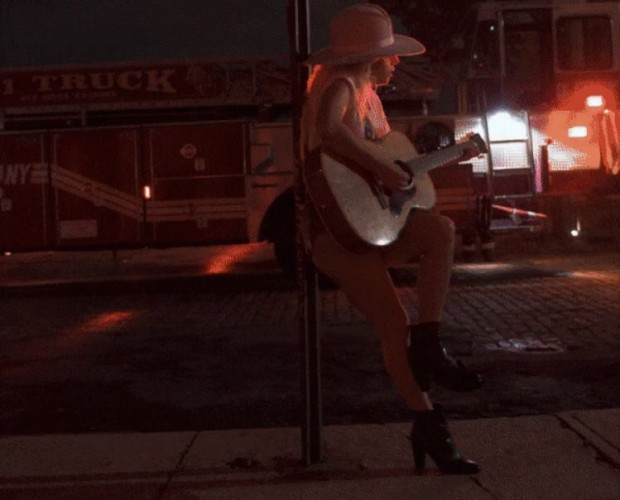 Outside Sunny’s Bar with Lady Gaga. Here she is playing guitar in front of the fire truck that arrived after her car caught fire during the shoot. Shot for Bud Light Dive Bar Tour in Red Hook, Broolyn, NY., 2016.
